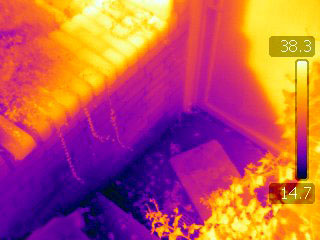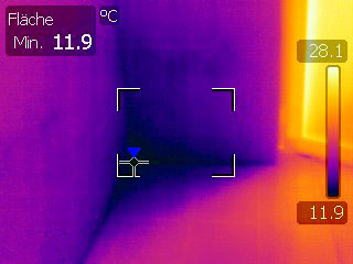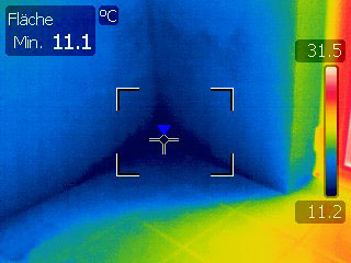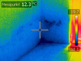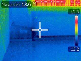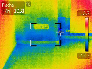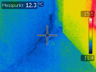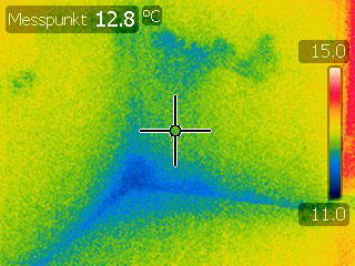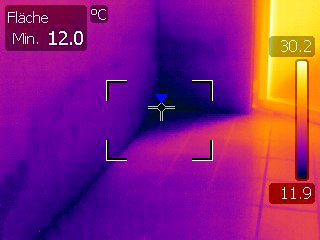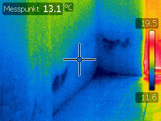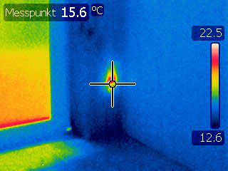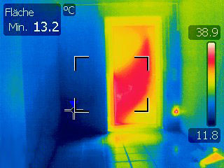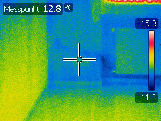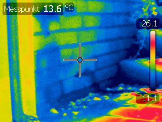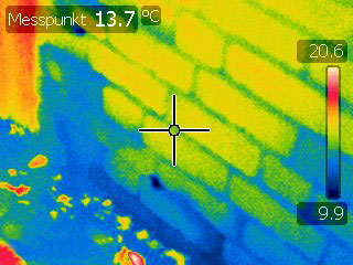 Betrachtet man Bild 1, zeigt dieses sehr deutliche Wärmebrücken mit hohen Temperaturunterschieden die Außenwände des Einfamilienhauses sind in monolithischer Bauweise (Hochlochziegel) ausgeführt, die Stürze und die Stirnseiten der Decken besitzen keine Dämmplatte. Die unterschiedlichen Oberflächentemperaturen sind im Thermogramm durch verschiedene Farben analog der neben der Abbildung stehenden Farbskala dargestellt. Bei einer entsprechenden Temperaturdifferenz zwischen innen und außen werden die Bauteile in Abhängigkeit ihrer Wärmedurchgangskoeffizienten (U-Werte) sowie ihrer Luftdurchlässigkeit abgekühlt. Die verminderten Oberflächentemperaturen können am Thermogramm sichtbar gemacht und lokalisiert werden.
